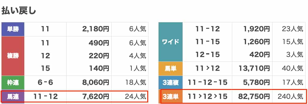 | 結果 | 3連単→11-12-15 馬連→11-12 |