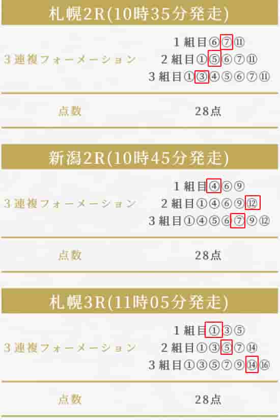 無料情報で札幌2R・新潟2R・札幌3R、まさかの全部的中!自分は1点500円で買ってたんですが、それでも【315,050円】の払い戻し…。もちろん大満足なんですけど、もし1000円で買ってたら倍の【630,100円】だったんですよね。そこだけはちょっと悔しいw。でも無料でここまで当ててくれるなんて、本当にすごいです!