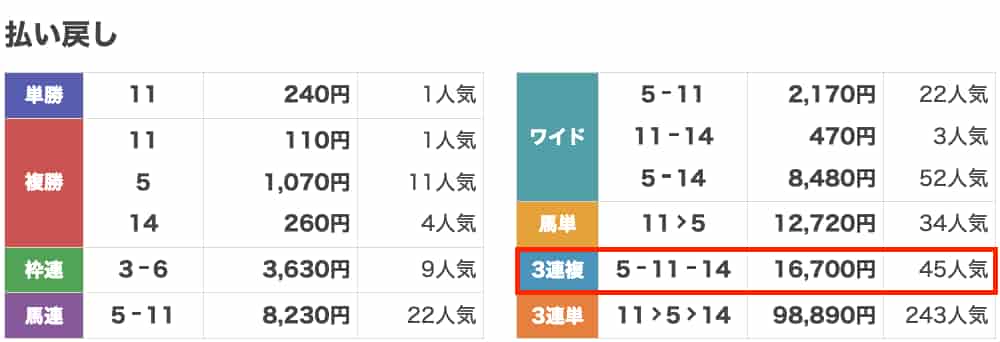 中京1Rでの3連複、5-11-14が見事に的中!
