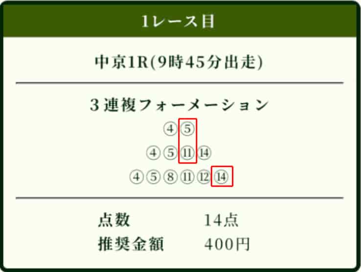 競馬初心者で少し不安でしたが、公開されていたフォーメーションをそのまま購入して大当たり!中山6Rでこんなに稼げるなんて思ってもみませんでした。登録して本当に良かったです!