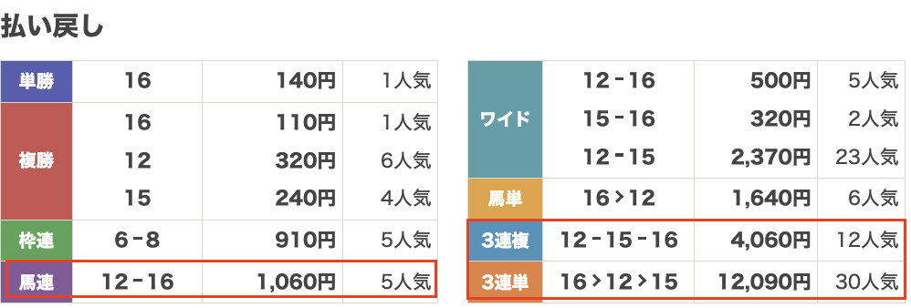 | 払い戻し金額 | 馬連→1,250円 3連複→4,140円 3連単→23,960円 |