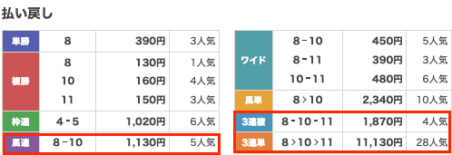 | 払い戻し | 馬連→830円 3連複→1,220円 3連単→5,520円 |
