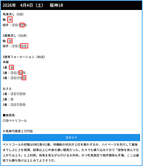 | 結果 | 馬連→1-6 3連複→1-6-7 3連単→1-6-7 |