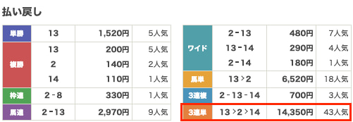 中山3R、13-2-14でズバリ!1,500円投資だったので、払い戻しは一気に21万5250円です。